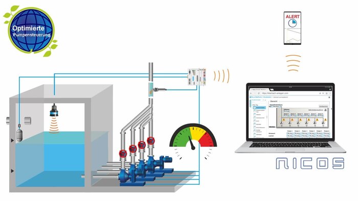 Pumpstationen müssen langlebig, betriebssicher und möglichst energieeffizient betrieben werden. Unsere Pumpensteuerungs-Komplettlösungen machen auch betagte Bauwerke für diese Anforderungen fit. Die installationsfertig aufgebaute Schaltschranklösungen übernehmen alle Steuerungs- und Regelungsaufgaben für dezentrale Pumpstationen und sorgen für einen effizienten Pumpenbetrieb. Über DSL oder Mobilfunknetz kommuniziert die Pumpstation mit der Leitzentrale NICOS. Alle wichtigen Messwerte, Störungen und Betriebsinformationen werden von der Außenstation gemeldet.