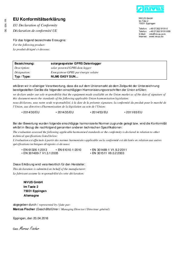 EU Declaration of Conformity "solar powered GPRS data logger NLM0 Easy Sun"