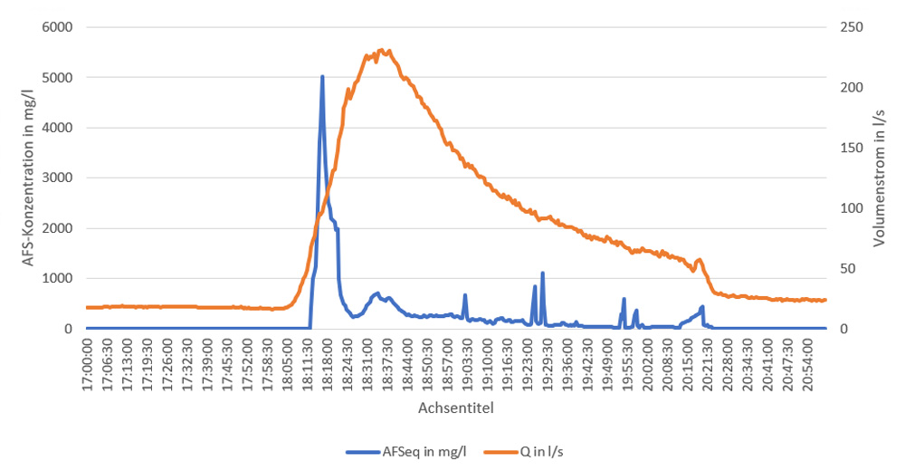 Ein einfaches Beispiel hierfür ist ein Fangbecken. In kleinen Einzugsgebieten mit ausgeprägtem First-Flush (Abbildung 1) kann das Fangbecken das Gewässer vor einem Großteil der Fracht schützen. Aber was ist, wenn die Konzentrationsganglinie aussieht wie in Abbildung 2? Ein Fangbecken nimmt nur den ersten Spülstoß aus dem Einzugsgebiet auf, das im weiteren Verlauf des Regenereignisses anfallende Wasser wird ungereinigt in das Gewässer eingeleitet. Hierbei würde ein Großteil der Fracht in das Gewässer gelangen.