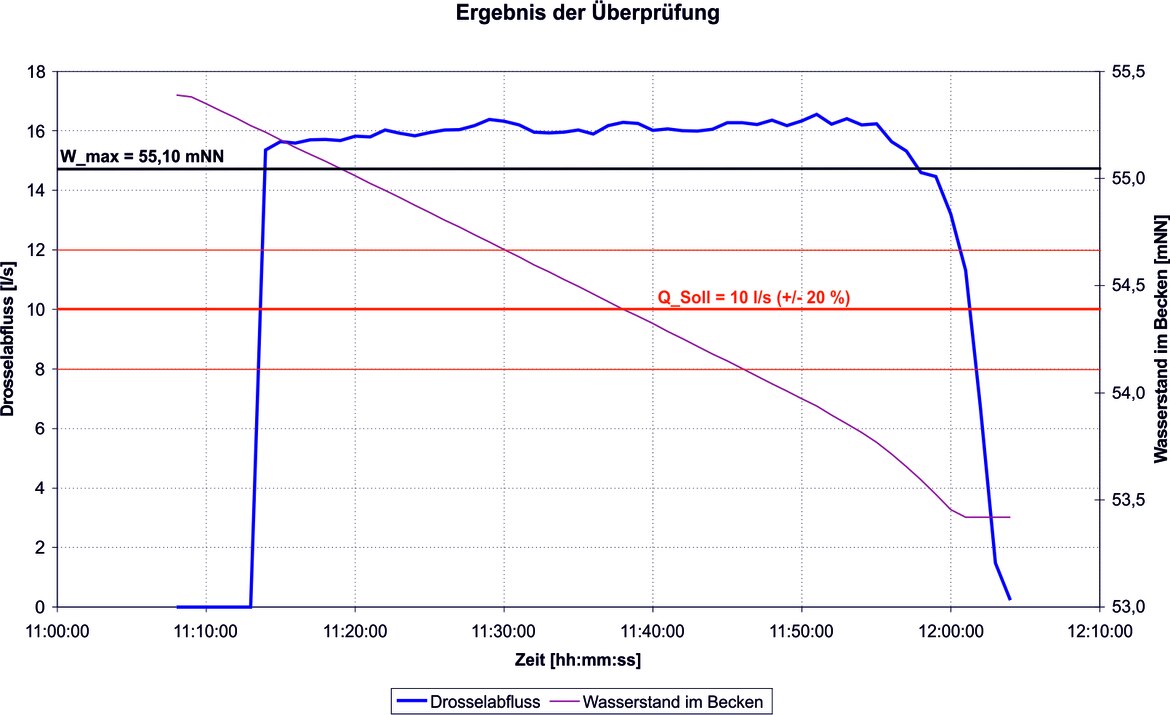 • Überprüfung der genehmigten Weiterleitungsmenge von Q = 10 l/s (Messwerte dürfen nicht mehr als 20% vom Sollwert abweichen)