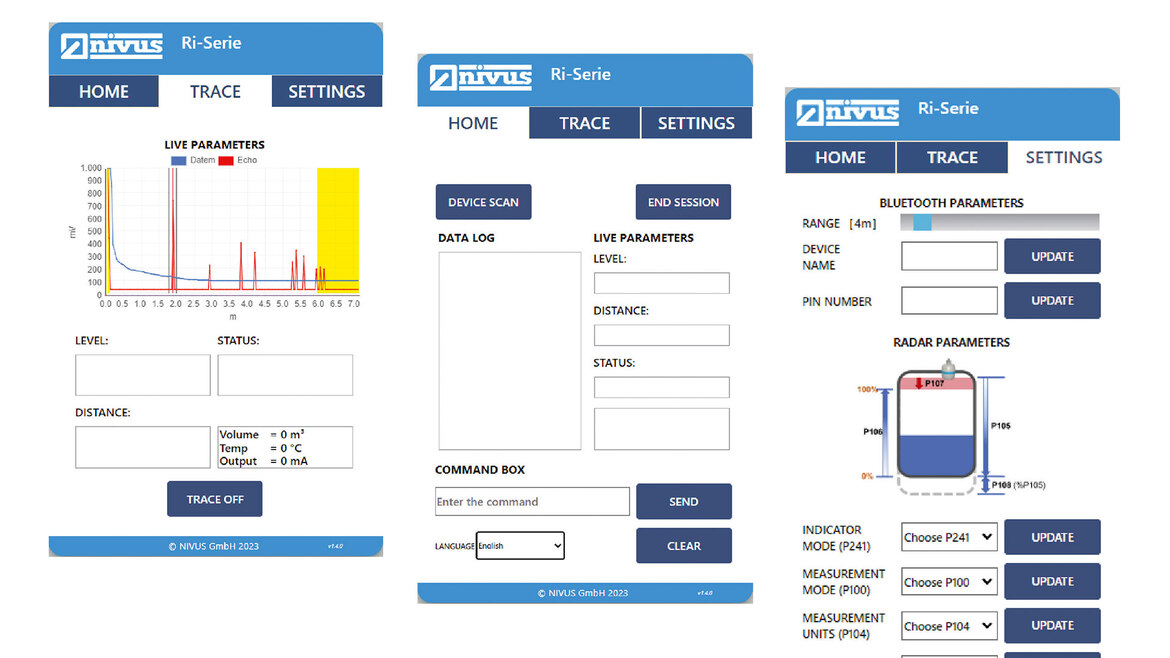 With a web-based user interface, the Ri sensor offers a simple and convenient way to change parameters, display echo curves and change the Bluetooth range. This web app is accessible via any browser on any operating system (Windows, Android or iOS). Compared to a conventional app, no software and associated updates need to be installed.
