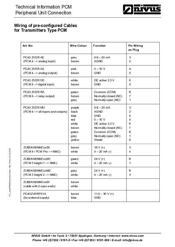 Wiring of pre-configured Cables for Transmitters Type PCM