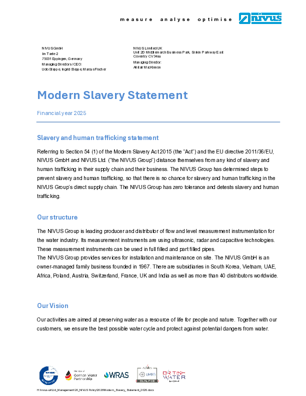 The social responsibility in all areas of the NIVUS's business has a long tradition. NIVUS does feel more than just obliged, it is a wish of the owner family to care about social responsibility. Regarding this NIVUS cares about values, fosters the employees and is committed to helping the socially disadvantaged.