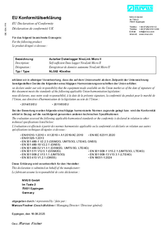 NivuLink Micro II is an integrated component of our consistent communication concept. The device is already added to the NIVUS WebPortal at the time of delivery and thus immediately ready for use. Secure data transmission is an integral part of our connectivity and is guaranteed right from the start - that's what we call secure plug & play.