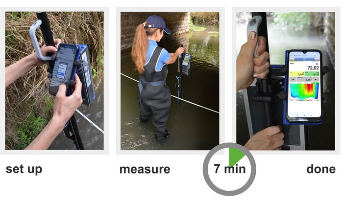 The compact system can be easily transported in any car and is ready for use within seconds. Convenient operation via smartphone or tablet makes measurements simple and intuitive. With a short briefing, even users who have never worked with this device before can immediately perform Error-free and reliable measurements. The system contains no wearing parts and is maintenance-free. All components are weight-optimised and compactly attached to the holding rod, which makes handling in the water effortless and safe.