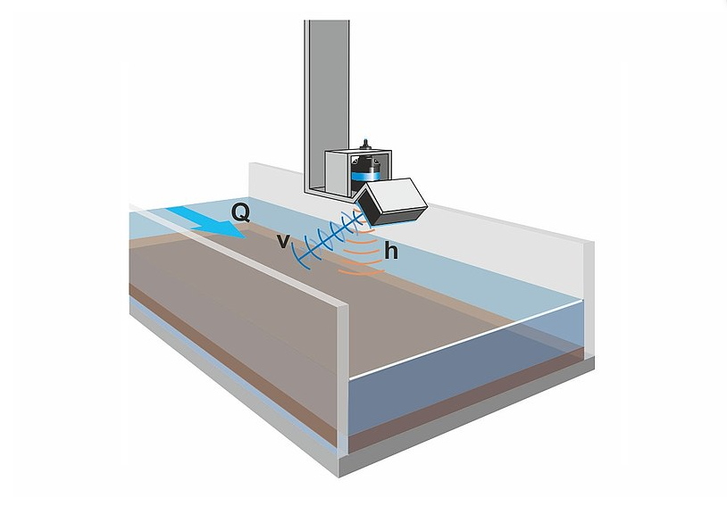 - The system measures the velocity of the surface waves and calculates the current flow rate from this velocity, the measured level and the defined rectangular channel shape.