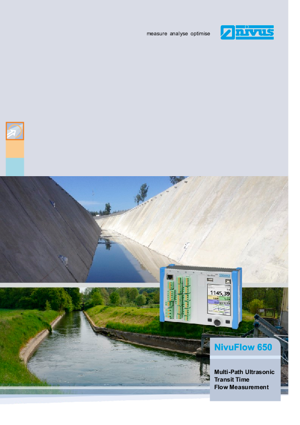 The NivuFlow 650 is compliant with ISO 6416, IEC 60041 as well as ISO 748 and has been developed for accurate flow measurement in open channels, part filled and full pipes and surface water bodies. To meet the highest possible accuracy requirements it is currently possible to utilise the NivuFlow 650 using up to 4 velocity paths, with extension modules up to 32 velocity paths.