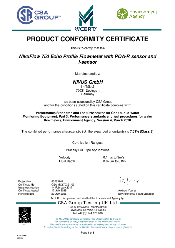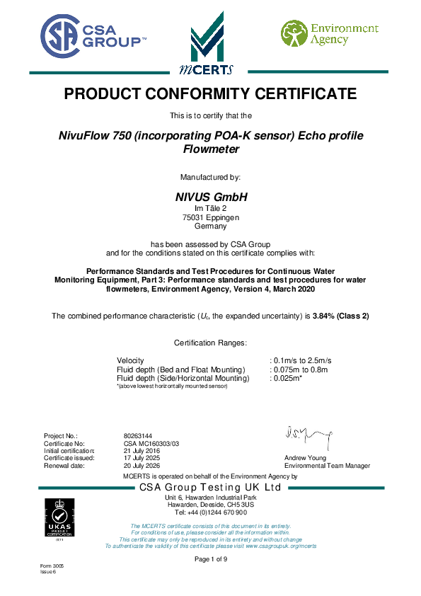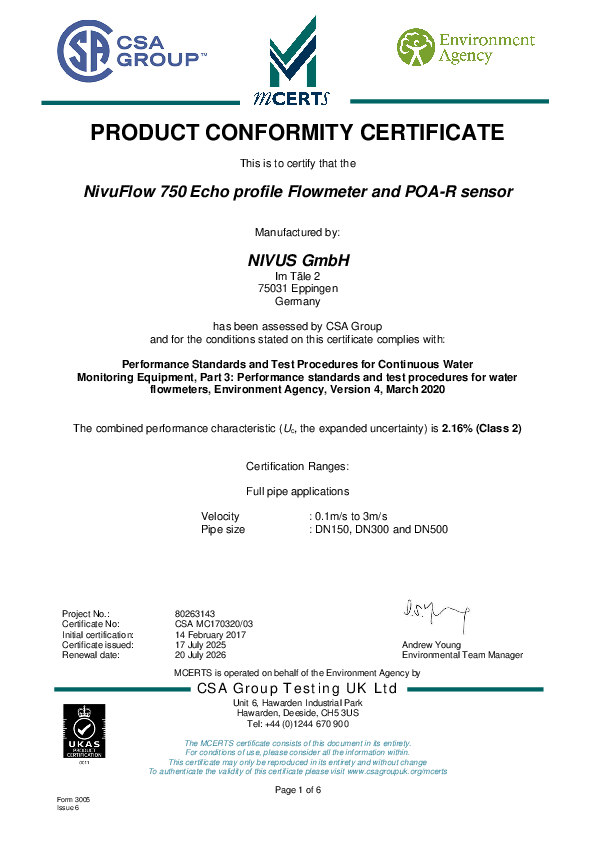 MCERT | NivuFlow 750 Echo Profile Flowmeter and POA-R sensor