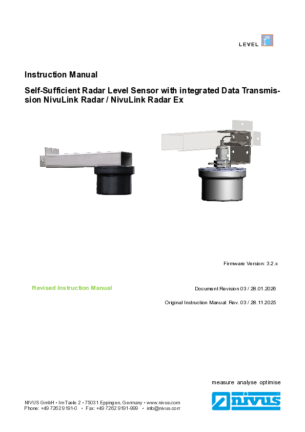 Instruction Manual | Self-Sufficient Radar Level Sensor with integrated Data Transmission NivuLink Radar / NivuLink Radar Ex (Rev. 03)