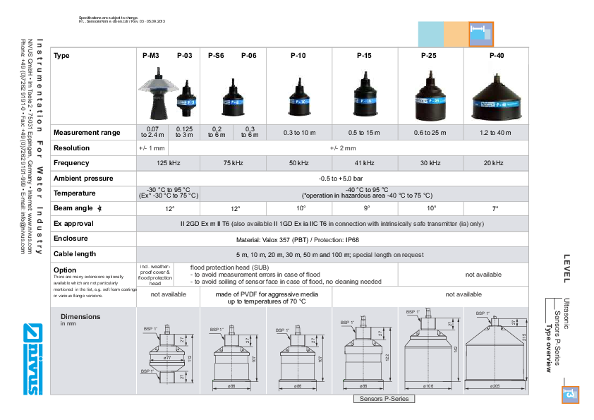 Les capteurs Série-P sont adaptés pour des mesures continues de niveaux d'eaux et eaux usées. Pour raccordement aux appareils d´exploitation de la série NivuMaster. Adaptés aux conditions environnantes difficiles.