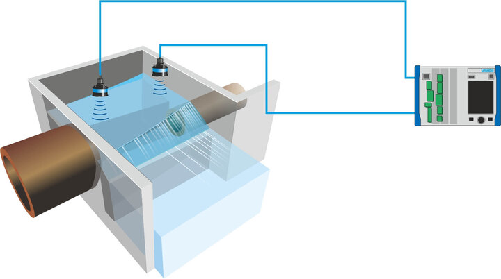 Sur des déversoirs avec reflux, le facteur de correction de déversement nécessaire pour la mesure de débit ou pour l´acquisition du déversement, change. Par le biais de deux mesures de niveau parallèles installées dans l´eau d´amont et l´eau d´aval, le degré de reflux actuel sur le déversoir peut être calculé. Ainsi, le facteur de correction de déversement pour la situation actuelle peut être déterminé et à l´aide d´un transmetteur approprié, p. ex. le Calculateur Hydraulique Plus, le débit ou le déversement correct peut être enregistré.