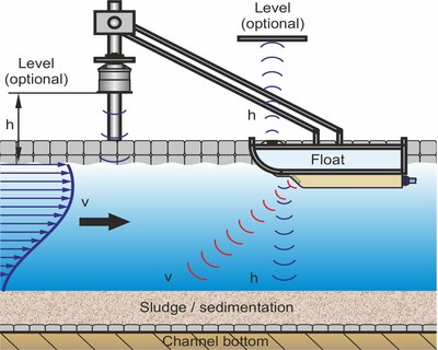- Pływający czujnik oblicza objętość przepływu na podstawie wykrytego poziomu przepływu i profilu przepływu. Warstwy sedymentacyjne są wykrywane i kompensowane automatycznie.